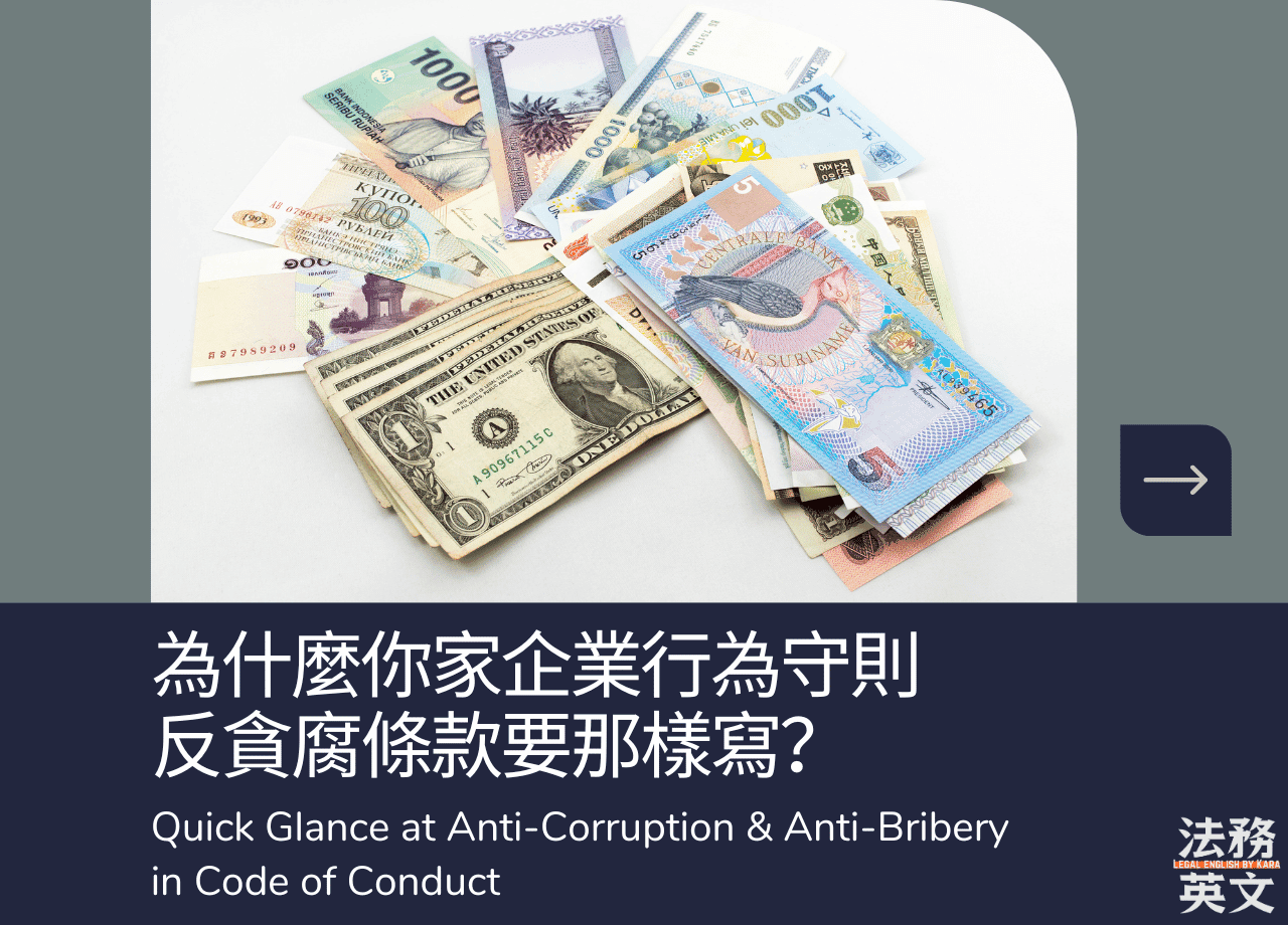 不過相較於教授從法源談起,本文談這個主題的角度,是從一個 inhouse 法務對於設計這個行為守則反貪腐章節的角度出發,討論重點條款的中英文為什麼要這樣寫,怎麼寫以及注意事項。