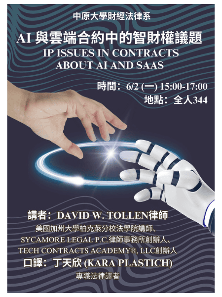 I had the honor of inviting David Tollen, bestselling author of The Tech Contracts Handbook, to Taiwan for a book launch and a series of four talks in Taipei. I also served as the interpreter throughout the events, helping him share firsthand insights on tech contracts and generative AI law with the Taiwanese legal community. Topics included: